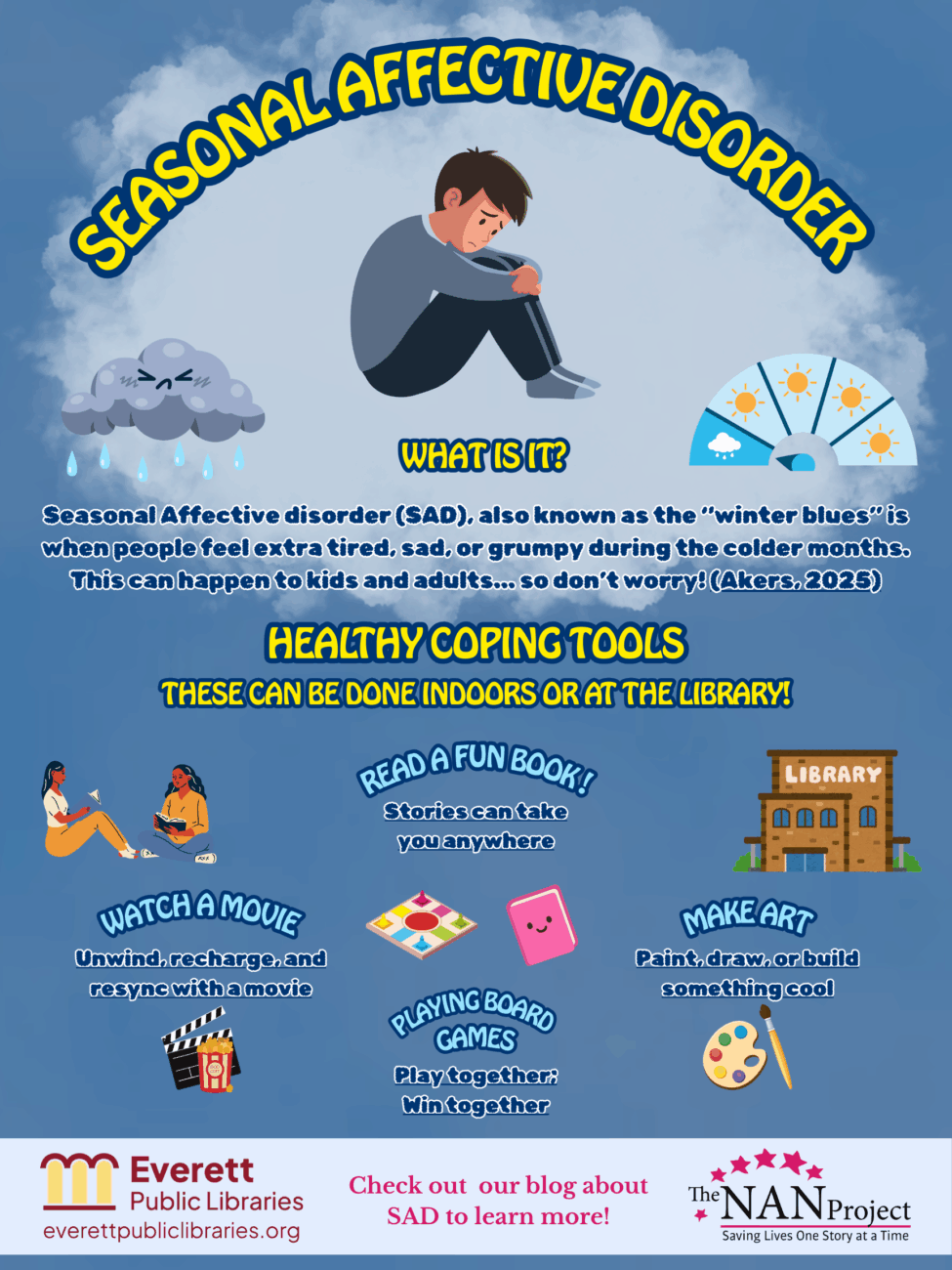 Before you go, don’t forget to check out our Seasonal Depression Media Guide. It’s a quick, accessible resource curated by Peer Mentor Kylee to help you better understand SAD, learn healthy coping strategies, and find supportive tools you can use throughout the winter months. Whether you’re looking for tips, educational content, or just want to feel a little more prepared as the days get darker, our guide is a great place to start.